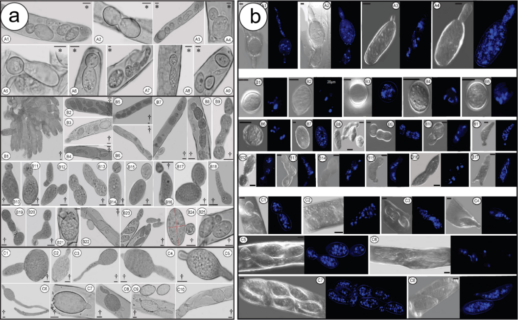 近日,PA视讯登录入口杜习慧课题组对羊肚菌属物种秋天羊肚菌(Morchella galilaea)开展分子、形态和细胞生物学等研究,首次在羊肚菌属中发现具有1-16个孢子的子囊,子囊内孢子的形状和大小存在显著差异,并且羊肚菌的子囊孢子可以通过两种方式萌发:1)通过萌发芽管形成菌丝;2)通过出芽生殖在子囊孢子的一个、两个或多个位点直接出芽形成分生孢子。子囊孢子出芽生殖产生分生孢子的现象在盘菌纲中仅有零星报道;在羊肚菌科中本次则属于首次发现。秋天羊肚菌的子囊孢子具有0 到20个左右不等的细胞核,而子囊孢子产生的分生孢子具有1-6个细胞核。细胞核可以从子囊孢子迁移到分生孢子。秋天羊肚菌产生多孢或少孢子囊的现象可能与子囊孢子出芽产生分生孢子、子囊内多次有丝分裂、有丝分裂缺失、细胞核退化或胞质分裂缺陷等有关。本研究不仅对认识羊肚菌属真菌的生活史提供了重要的新见解,更拓宽了对盘菌纲真菌孢子形成和繁殖策略的认识,同时,也呼吁关注盘菌纲内更多类群子囊孢子直接产生分生孢子及孢子数目和形态多变的现象,这对全面认识子囊菌的个体发育和生活方式多样性具有重要的生物学意义。