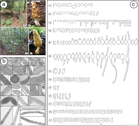 图1a:秋天羊肚菌(Morchella galilaea); 图1b:秋天羊肚菌不同形态的子囊孢子;