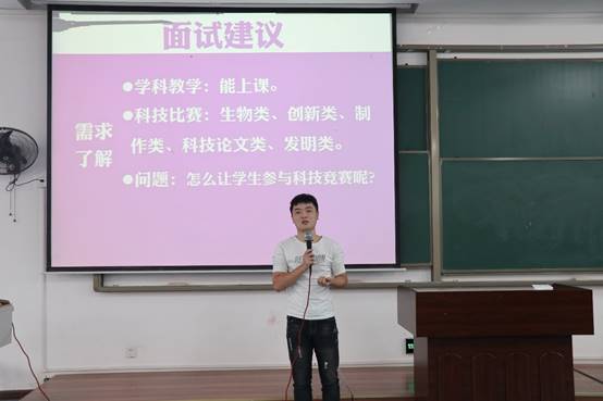 最后,邹校长从用人单位的角度对同学们提建议:仪表、说课、面试、学校需求、工作状态等方面都需要做充分的准备。邹校长还结合自己学校的情况说明了合作的重要性,在工作中学会相互配合。另外,邹校长还提供了玉带山小学的创新、创意工作案例,再次强调了创新能力的重要性。互动环节,邹校长提问:生物教师如何调动学生参赛积极性?问题层层深入,同学们积极思考并回答问题,对生物教师如何开展工作有了更深入的了解。
