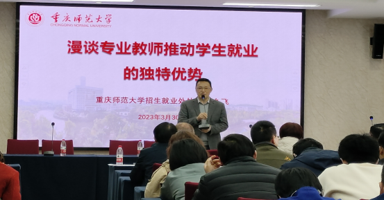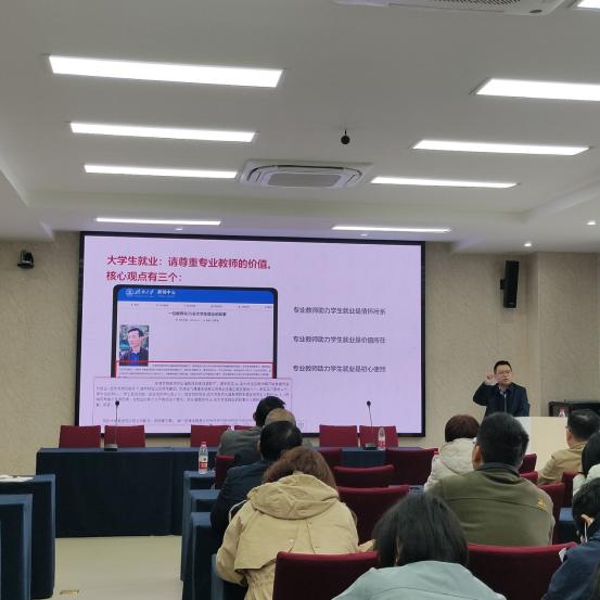会上,学校招生就业处冉久飞处长以“漫谈专业教师推动学生就业的独特优势”为主题进行讲解,讲座围绕“大学生就业工作怎么了”、“就业工作怎么看”、“就业工作怎么干”三个方面展开。他首先对pa视讯官方集团的就业基本情况进行了细致地分析,包括近五年毕业生去向落实率、2022届“七个率”统计、学生就业满意度等方面,同时,他从当前就业形势的特点和主要就业矛盾出发,帮助学院老师切实了解了当前就业形势的严峻程度。最后,他着重分析了专业教师在推动学生就业的天然优势,强调开展就业工作应尊重专业教师的价值,并提出了“解决思维、形成合力、分头行动”三大推动就业工作的务实办法。