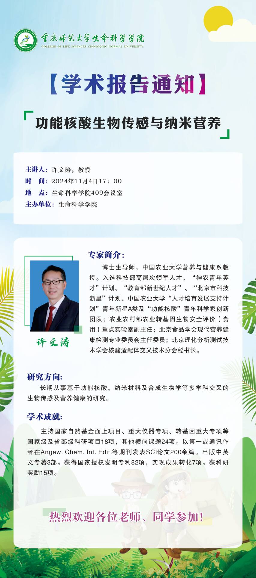 【学术报告通知】报告题目:功能核酸生物传感与纳米营养