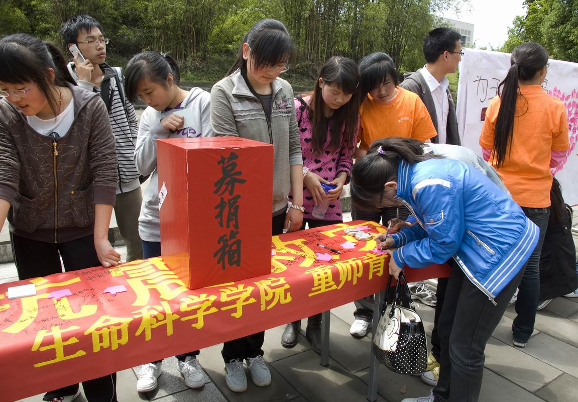 4月21日下午5点,pa视讯官方集团为玉树地震灾区捐款活动在沙坪坝校区办公楼413会议室举行。全院师生首先举行默哀仪式,沉痛悼念在本次地震灾害中逝去的玉树同胞。随后,学院领导带头向灾区捐款,全院教职工怀着对玉树地震灾区遇难者的无限缅怀,纷纷慷慨解囊,向灾区同胞送去一份关怀和祝福。几分钟时间,生科院就筹集到了第一笔爱心捐款共计4000余元。