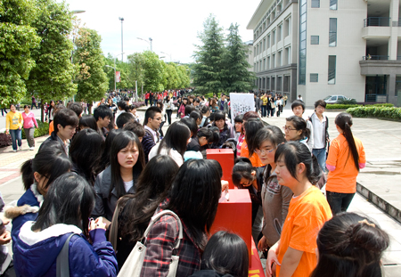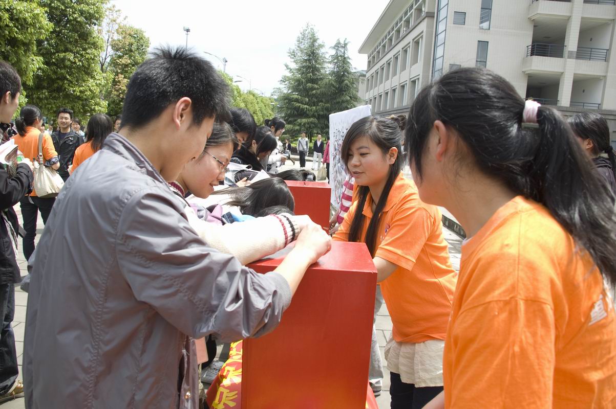 玉树地震也牵动着在我院求学的青海籍学子的心。4月21日中午12点,在学院的大力支持下,由我院青海籍学生马玉芳、窦文超与重师各个学院的青海籍同学取得了联系,在重师大沙坪坝和大学城校区发起了“重师学子为玉树祈福”大型募捐活动。他们希望可以借此和全校师生一起为青海祈福,募集善款,为玉树加油。活动中,陈斌、万朝晖、胡小强等党政领导再次带头把一份爱心投进了捐款箱。同时,师生们还将一颗颗写满祝福话语的红心贴在展板上,为玉树祈福。这一善举得到了学校校报、沙区电视台、重庆电视台等媒体的多次报道和支持。