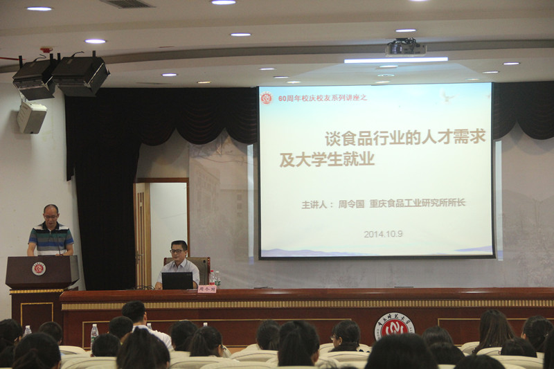 10月9日,pa视讯官方集团在凯撒报告厅举办了60周年校庆系列活动之校友讲座。我院77级校友、重庆食品工业研究所所长周令国为全院300名非师范专业学生带来了“谈食品行业的人才需求及大学生就业”的讲座。讲座由学院副院长李英文教授主持。