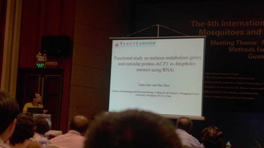 5月24-28日,我院青年教师乔梁、许柏英、付文博、闫振天、周勇一行五人赴广州参加了“第四届国际蚊虫及蚊媒病检测和防治学术研讨会暨第十届全国医学昆虫学学术讨论会(The4th International Forum for Surveillance and Control of Mosquitoes andMosquito-borne Diseases (IFSCMMD))"。其间,乔梁老师作了题为“Functionalstudy on melanin metabolism genes and cuticular protein AsCP1 inAnophelessinensisusing RNAi”的报告,向与会专家学者介绍了昆虫与分子生物学研究所在中华按蚊RNAi技术体系构建、黑色素代谢关键基因与表皮蛋白功能研究方面取得的研究进展。