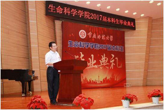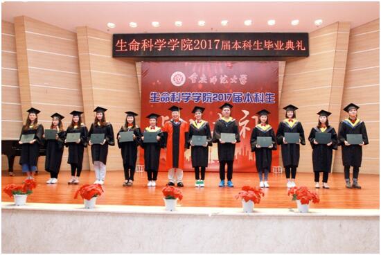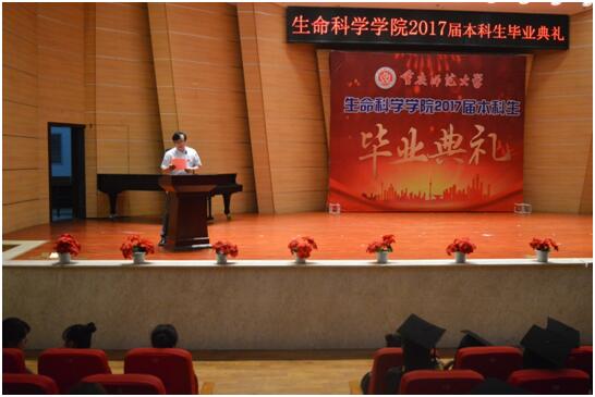 学生自制毕业短片《不说再见》展示了2013级富有理想、充满朝气的四年学习生活,有毕业生对学院的的深深感恩也有学院对毕业生的祝福与希望。接着,杨星勇教授作为教师代表,用“最后一课”的机会,希望2017届毕业生“加强学习、投身实践、不断完善自我”,在社会大舞台上交上合格课程答卷。在学院副院长张涛教授一一宣读了获得学士学位的同学名单后,院长陈斌教授为每位学子整理头顶流苏,颁发学位证书,典礼气氛达到高潮。随后,低年级学生的节目表演表达了对学长学姐远行的祝福。2013级生物科学专业的何莉在发言中回忆了在生科院大家庭成长的历程、表达了对恩师的敬意和作为一个重师生科学子不忘初心、砥砺前行的决心。同时,代表2013级全体同学为学院送上“立德树人”牌匾,祝福学院桃李满天下!