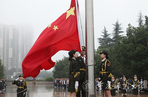 “升国旗仪式现在开始。”护旗手们护卫着五星红旗,迈着整齐、矫健的步伐登上升旗台。随着《义勇军进行曲》的奏响,五星红旗冉冉升起。全体师生高唱国歌,向鲜艳的五星红旗行注目礼。每个人的脸庞都洋溢着自豪与幸福。