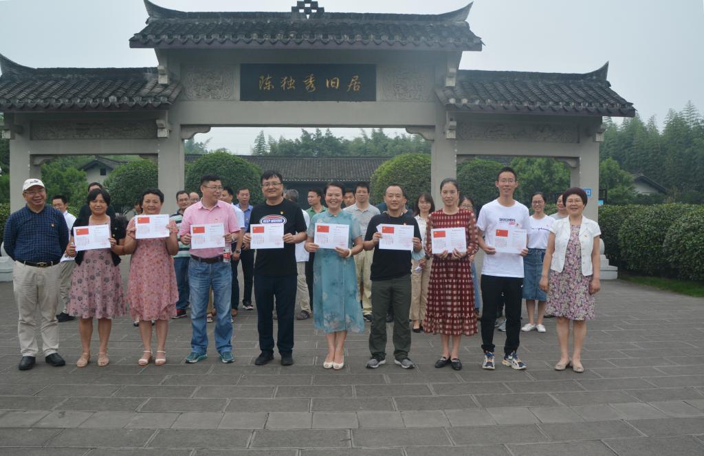 在陈独秀旧居陈列馆广场,学院党委书记万朝晖带领全体党员重温入党誓词,并给6月入党的教师党员过集体政治生日会,颁发了政治生日贺卡。