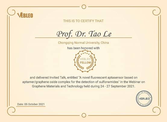 近日,我院乐涛教授被授予国际科学组织Vebleo协会会士(Vebleo Fellow),并受邀在Vebleo主办的石墨烯材料与技术网络研讨会(Webinar on GrapheneMaterials and Technology)中做了主题为“A novel fluorescentaptasensor based on aptamer/graphene oxide complex for the detection ofsulfonamides”的主旨报告(Keynote Talk)。乐涛教授介绍了他和团队在基于氧化石墨烯/适配体生物传感器领域做出的学术贡献以及潜在应用,特别介绍了近年来基于氧化石墨烯筛选核酸适配体,建立适配体荧光传感器应用于磺胺类抗生素的快速检测。