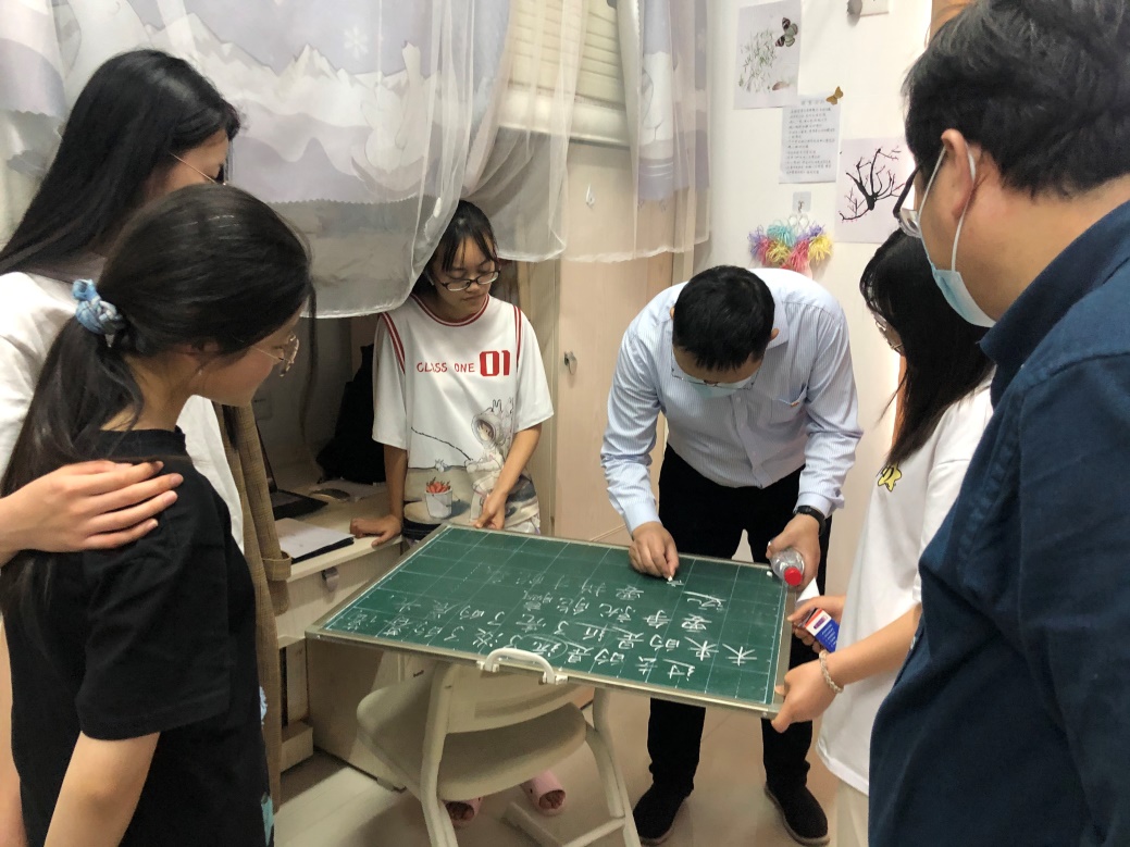 看到正在上网课的学生,付书记坐在学生的位置上,跟学生一起听网课,了解教学情况,体验网络信号传输流畅度。当看到宿舍里师范生练字的小黑板,付书记拿起粉笔,现场指导同学们如何调整汉字的间架结构,改善书法面貌。