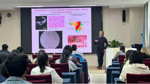 2024年4月25日下午3:00,英国知山大学Cher-Pheng Ooi博士受我院邀请,在逸夫楼409室为我院师生做了题为“Identification of a novel transcription repressor in Trypanosoma brucei using an RNAi library approach(运用RNAi文库鉴定布氏锥虫体内新型转录阻遏因子)”的报告。本次报告由学院副院长张涛教授主持,学院师生百余人参加。