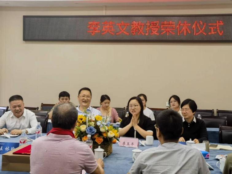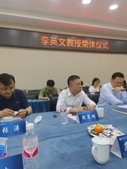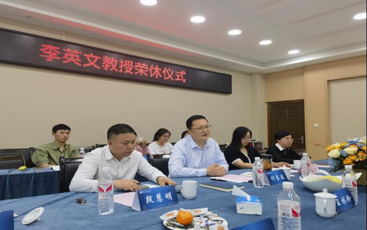 人事处副处长段慧明在讲话中感谢李英文教授对学校和学院的突出贡献,希望他继续支持学校学科的发展,同时表达了对李教授退休生活的美好祝愿;离退休处副处长李玉平热烈欢迎李英文同志加入离退休队伍,介绍了离退休处以人为本的工作宗旨和丰富多彩的退休生活,期待李老师发挥专业优势,关注学校学院发展建设。