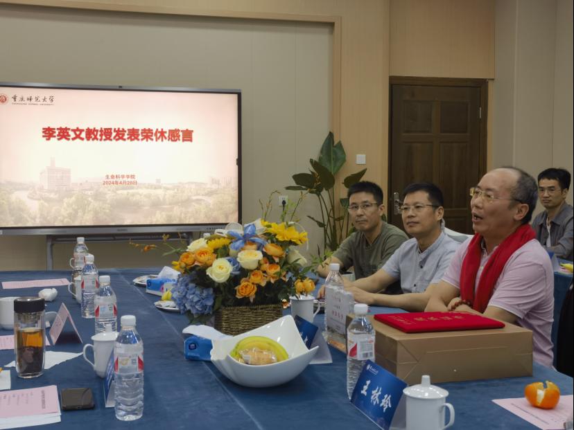 仪式伊始,生命科学学院党委书记付长波同志代表学院党政感谢李英文教授对学院事业发展所做出的卓越贡献,希望李教授继续关心支持学院的发展建设,祝福李教授的退休生活丰富精彩、健康顺遂。接着,参会人员一起观看李英文教授团队送上的荣休纪念视频,视频中,学生们纷纷送上祝福并感恩李英文教授的栽培和指导、共同回忆与李英文教授开展教学科研生活的点点滴滴,现场气氛温馨热烈。
