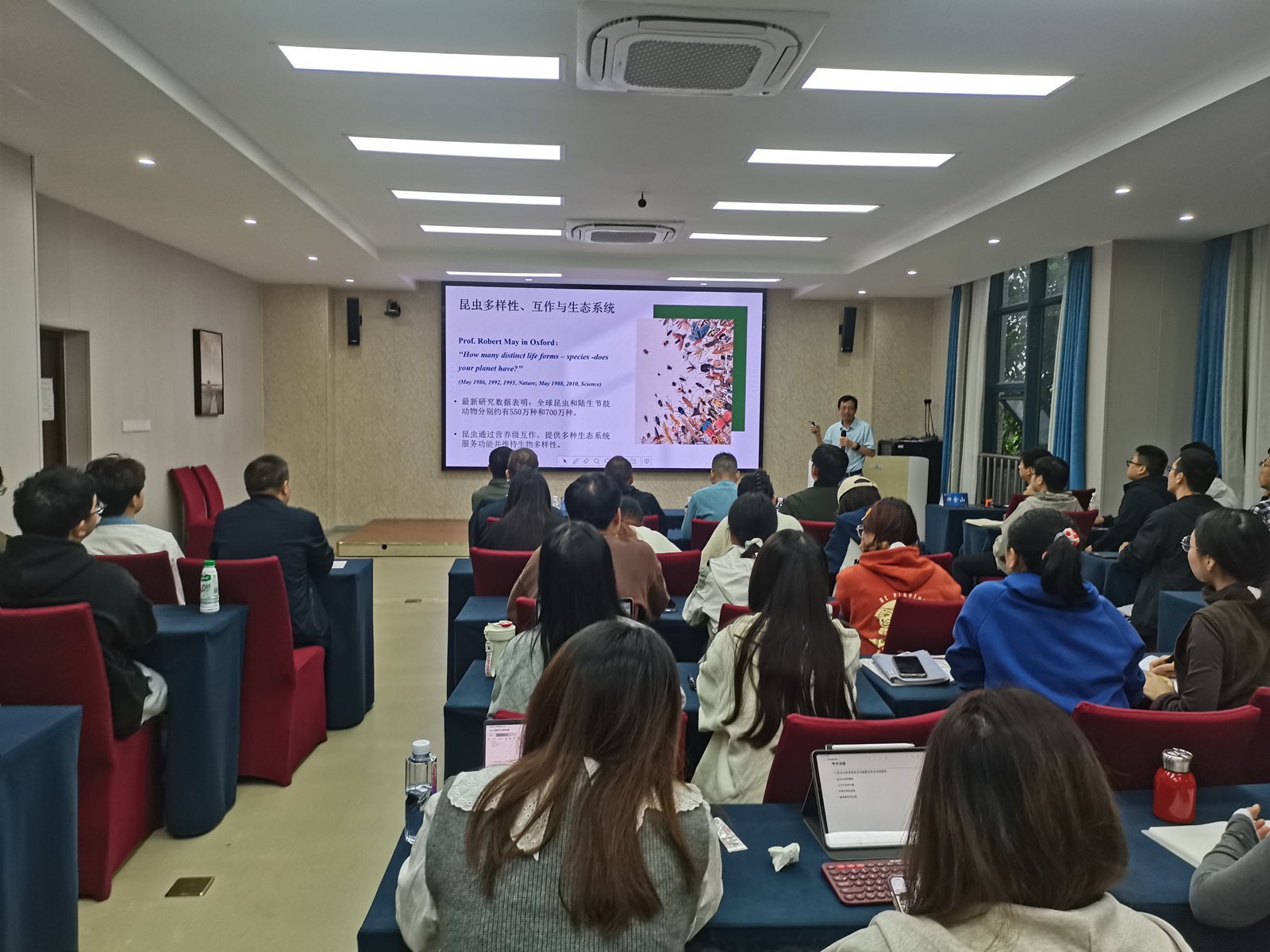 座谈会后,朱朝东研究员以“昆虫分类学促进多功能群互作生态学研究”为题进行了学术报告。他将枯燥的昆虫分类转化为一个个感人的故事,将对科学问题的探索比作“白日梦”,给生科院的师生们带来了一场别开生面的学术报告。此次报告不仅拓宽了大家的学术视野,更是从精神层面引导师生既要严谨、踏实、肯吃苦,也要满怀热情、勇敢追梦。