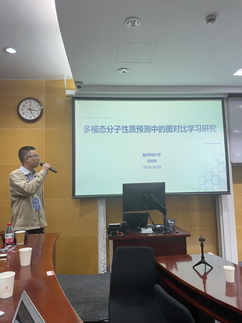在大会“人工智能与药物开发”分会场,我院博士研究生吴锦洲作了题为“多模态分子性质预测中的图对比学习研究”的报告。该报告针对深度学习在生物分子性质预测中面临的通用图增强手段可能破坏分子结构特性和低维表示,而忽略了关键几何信息的问题,提出了一种基于图对比学习的多模态分子性质预测研究方法,旨在提高分子性质预测的准确性和跨物种泛化性。