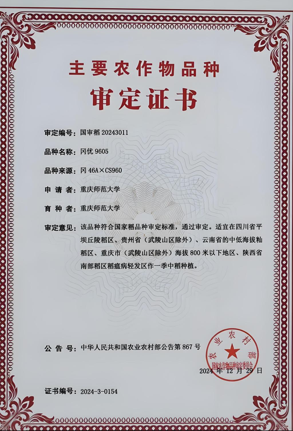 “冈优9605”于2021年参加国家区域试验,2022年进入续试,2023年进行生产试验,经严格的试验筛选,抗病、抗虫、耐热和耐冷鉴定,稻米品质检测,2024年在多个品种中脱颖而出,推荐审定。经国家农作物品种审定委员会水稻专业委员会初审,国家品种审定委员会大评委复审,公示1个月,发布审定公告等程序后,于2024年12月29日颁发审定证书。