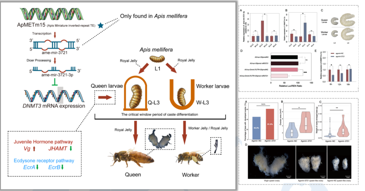 在该项研究中,团队成员通过全基因组分析,鉴定出一种西方蜜蜂(Apis mellifera)基因组中特有的转座子ApMETm15及其衍生的miRNA(ame-mir-3721-3p)。通过时空表达分析、靶基因预测和荧光素酶报告基因实验等多种方法,研究人员确认ame-mir-3721-3p能特异性结合并抑制DNA甲基化酶基因DNMT3的表达,该基因编码一种关键的表观遗传调控酶,负责催化DNA胞嘧啶第5位碳原子的甲基化修饰,进而影响染色质结构和基因表达,并调控下游保幼激素和蜕皮激素信号通路相关基因表达。研究发现,ame-mir-3721-3p的过表达显著抑制DNMT3表达,并显著上调卵黄蛋白前体基因(Vg)的表达,同时抑制保幼激素酸甲基转移酶基因(JHAMT)和两个蜕皮激素受体基因(EcrA/B)的表达,构建了一个完整的表观遗传调控网络,进而驱动蜜蜂的种姓分化。研究人员进一步合成了miRNA模拟物,通过表型观测与分子鉴定,验证了其蜜蜂幼虫L3期即种姓分化关键窗口期发挥作用,调节了出房蜂的卵巢发育。