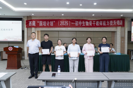 6月22日下午,“国培计划(2025)”——西藏全区初中骨干教师能力提升培训班结业典礼在我校三春湖会议厅举行。结业典礼由项目负责人郝友进教授主持,pa视讯官方集团党委书记付长波、项目管理团队、全体参训学员、学科教学(生物)研究生参加典礼。