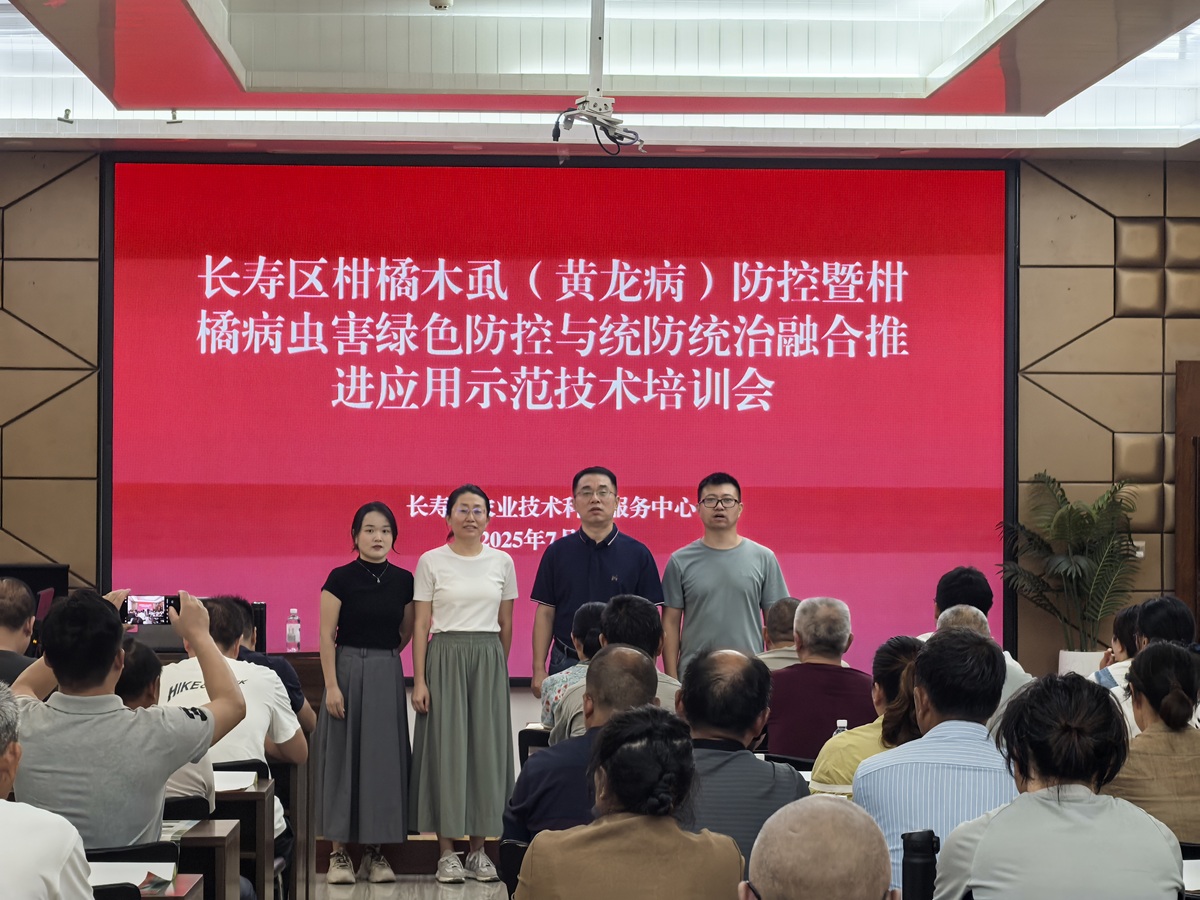 为深入贯彻落实重庆市“教育强市区县行”行动部署,推动高校智力资源精准服务地方产业发展,2025年7月24日,PA视讯登录入口农林病媒害虫可持续绿色防控团队邱宝利教授、张利荷博士应长寿区农业农村委员会邀请,深入长寿区开展柑橘木虱(黄龙病)防控暨柑橘病虫害绿色防控与统防统治融合推进应用示范技术培训。