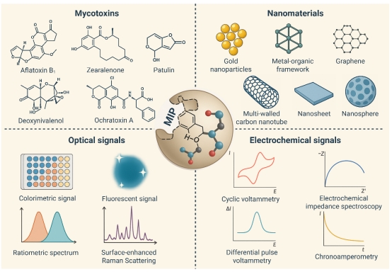 该论文深入综述了MIPs在典型真菌毒素检测中的设计原理、合成策略及性能优化路径。研究指出,传统天然受体在复杂食品基质中存在稳定性差、易失活等问题,而MIPs作为一种可编程的“人工受体”,具有高选择性、可重复使用、耐高温和酸碱稳定性强等突出优势。在理论层面,该论文系统阐述了“理性分子设计”在印迹聚合物构建中的关键作用,强调通过密度泛函理论、分子动力学模拟及机器学习算法实现模板分子与功能单体的精准匹配,从而显著提升材料识别性能与灵敏度。此外,作者综述了MIPs与纳米材料的复合策略,展示了其在光学、电化学及光电催化等多模态生物传感中的性能突破。论文进一步指出,智能响应型和自供能型MIP传感器是未来发展方向。这类材料可通过光、电、pH或温度刺激实现模板分子温和释放与再生识别,为便携式、现场快速检测系统提供了新方案。团队还提出了基于AI的分子印迹设计理念,可利用大数据与模型预测加速材料筛选与优化,实现从“经验驱动”向“数据驱动”的创新跃迁。该研究为食品安全、环境监测及公共卫生风险防控提供了可推广的技术框架,对推动MIP传感技术从实验室研究向智能化、绿色化和产业化应用转化具有重要指导意义。