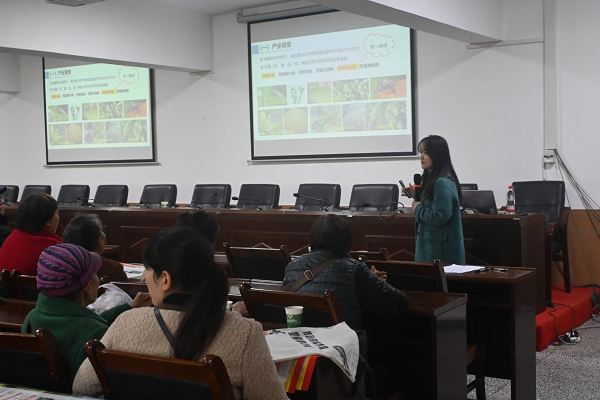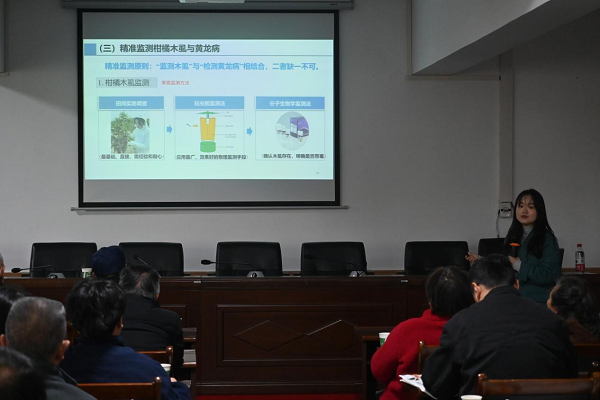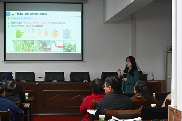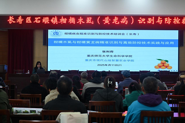 2025年11月21日 由重庆市长寿区农业农村委举办的长寿区柑橘木虱(黄龙病)识别与防控技术培训会,在长寿各区县展开,长寿区拟累计培训人数1200人。21日上午和下午分别于长寿区石堰镇人民政府和双龙镇人民政府举行,我校pa视讯官方集团老师张利荷应邀作为主讲专家为长寿区各个街镇植保负责人、技术骨干、柑橘合作社代表及种植大户们,对柑橘木虱的精准识别、精准监测及高效防控进行系统的授课,旨在及时提高大家对柑橘木虱和黄龙病的识别度和防范意识,及时做好防范工作。