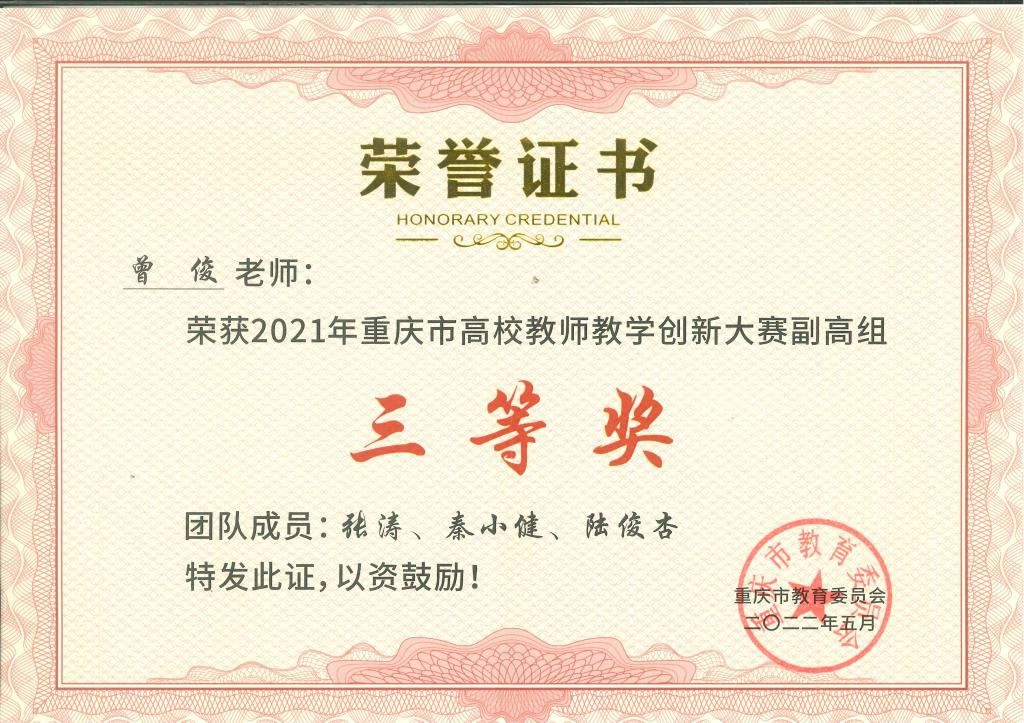近日,重庆市2021年高校教师教学创新大赛获奖名单揭晓,我院教师曾俊副教授喜获三等奖。