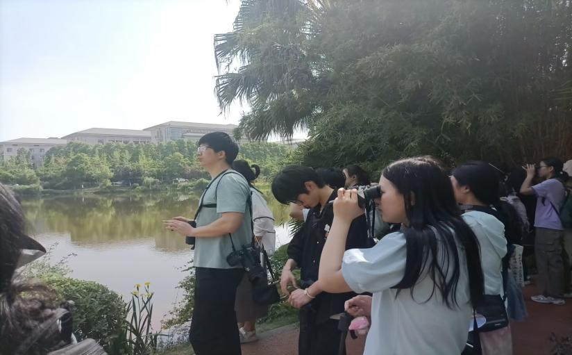 合影留念后,观鸟活动在专业老师的指导下正式展开。沿途,老师详细介绍了白头鹎、白颊噪鹛、珠颈斑鸠、领雀嘴鹎以及黑天鹅等多种鸟类。同学不仅了解到了不同鸟类的生活习性,以及如何辨别白颊噪鹛的性别和年龄,还认识到像白头鹎这种在我们眼中最寻常不过的鸟儿,也可能是他人从未见过的种类。