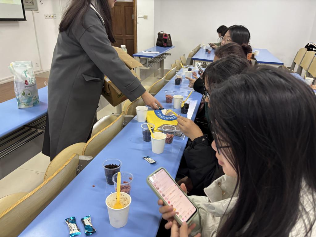 活动伊始,主持人为同学们介绍什么是藕粉以及藕粉制作的具体步骤,通过生动的讲解和视频观看,同学们对藕粉这一美味健康的传统美食有了深刻的了解,为后续藕粉制作奠定了坚实的理论基础。在制作环节,同学们依次领取了制作藕粉所需的工具和材料,包括山楂片、花生碎、奥利奥碎、红豆、藕粉、纸杯、勺子等材料。在协会干事的耐心示范与指导下,同学们开始了趣味满满的制作过程。从用热水化开到最后添加适量坚果,每一步都需要同学们全神贯注把控材料的用量,同学们相互协作、相互交流、不断调整冲兑比例,力求将每一份藕粉都制作为最美味的状态。