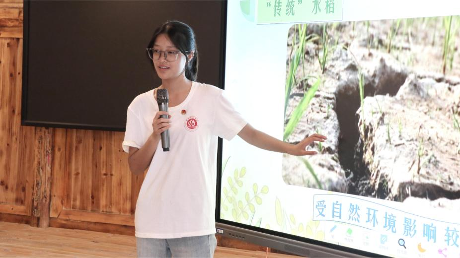 随后,陈志奕同学以当地特色农产品贡米为纽带,从稻谷起源娓娓道来,串联起传统水稻的发展脉络。她着重讲述了袁隆平院士的攻关事迹,从他在田间地头不懈探索,到成功培育出高产杂交水稻,唤起孩子们对粮食安全的珍视;并紧扣何家岩村水稻特色,解读种植科学,让生态之美与科普之光交融,让孩子们在感知乡土作物中,读懂科技赋能农业的深远意义。