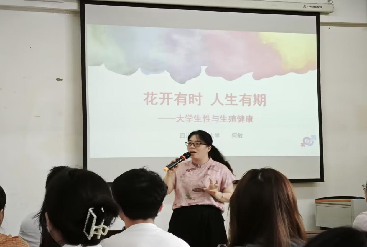 随后,生物协会的志愿者们引导同学们参加四川外国语大学副教授、硕士生导师何敏主讲的以《花开有时 人生有期——大学生性与生殖健康》为题开展青春健康专题讲座,破解同学们对“性”的认知误区,让在场同学充分了解生殖健康知识,明白了如何科学认知自我、保护自我。