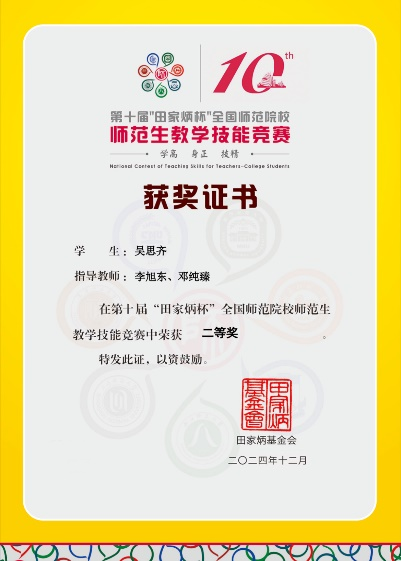 此外,吴思齐同学在我校李旭东、邓纯臻两位老师的指导下,在第十届“田家炳杯”全国师范院校师范生教学技能竞赛中获得二等奖,通过精心组织教学设计优化、模拟课堂训练及即兴讲演技巧的准备,以良好的专业技能、扎实的专业知识,展现了精湛的教学素质。