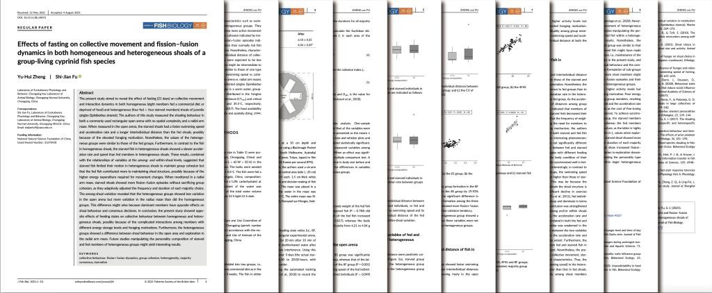 他热爱科学研究,大二进入PA视讯登录入口进化生理与行为学实验室学习,师从付世建教授。参研省级大创项目一项、校级项目两项,主持校级重点项目《异质性对鱼类群体决策的影响及作用机制研究》,重点研究饥饿对鱼类集群行为的影响,讨论了禁食对鲤科鱼类群体运动和裂变融合动力学的影响。项目获得PA视讯登录入口第四届“三春湖杯”课外学术科技作品竞赛一等奖,并以第一作者发表SCI论文《Effects of fasting on collective movement and fission–fusion dynamics in both homogeneous and heterogeneous shoals of a group-living cyprinid fish species》。