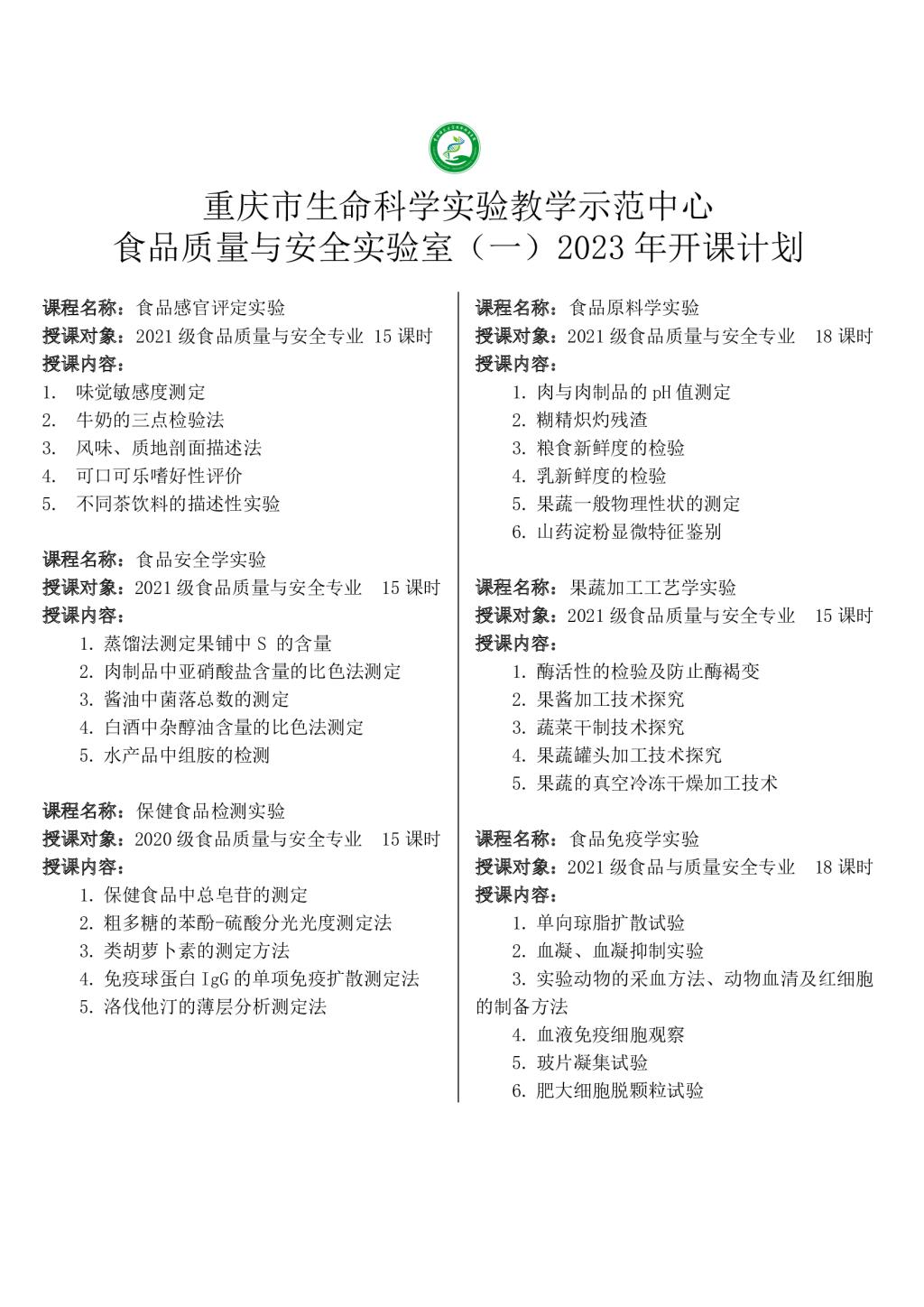 重庆市生命科学实验教学示范中心食品质量与安全实验室(一)2023年开课计划