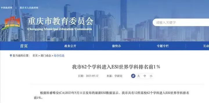 ESI指标是用来评价一所高校(或机构)科研水平的重要参考标准,具有广泛的代表性,已经被全球普遍认可。其数据库主要通过机构发表的SCI/SSCI收录期刊论文的总被引次数,按22个学科进行排名,以10年为一个统计周期,其数据每2个月更新一次,均为上一次数据的基础上增加2个月的数据,每年5月份除掉最早一年的数据。因此,本次公布的数据是一年中变化最大的一次,数据覆盖时间段为2013年1月1日到2023年2月28日。