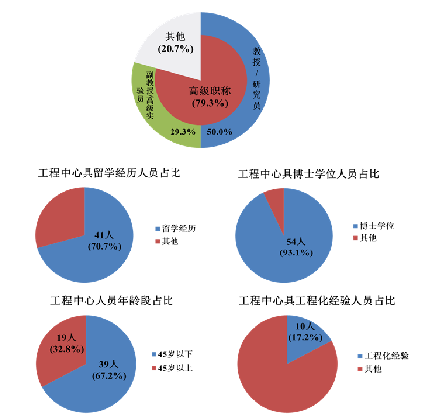 工程中心重视团队建设与人才培养,外引中科院院士有效候选人、俄罗斯自然科学院外籍院士、国家“万人计划”科技创新领军人才等国家级人才;各类省市级人才数量逐年增长,重庆市科技创新团评估期间增加3个,外引内培杰出博士、优秀博士和优秀业家(客座)22人。目前,工程中心成员由所依托的化学学院和pa视讯官方集团部分人员组成,工程中心拥有博士生导师12人、硕士生导师53人;拥有向仲怀院士、戚正武院士、赵进东院士3名客座院士,拥有中科院院士有效候选人、俄罗斯自然科学院外籍院士、国家高层次人才特殊支持计划(“万人计划”)科技创新人才、“新世纪百千万人才工程”国家级人选等。工程中心还拥有国家现代农业产业技术体系岗位科学家、重庆市“两江学者”特聘教授、重庆高校“巴渝学者”特聘教授、国务院政府特殊津贴获得者、重庆市学术技术带头人及后备人选等。逐渐形成了一个年龄结构、知识结构更加合理,具有较强核心竞争力的国内先进并具一定国际影响的研发团队。目前,工程中心拥有固定工作人员58人,其中45岁以下39人,占67.2%;客座流动人员12人,多为生物科技公司的负责人、重点实验室负责人。固定人员中,高级职称人员46,占79.3%(其中教授/研究员29人,占50.0%,副教授/高级实验师17人,占29.3%),拥有博士学位54人,占93.1%,具有国外留学经历人员41人,占70.7%,具有工程化经历与经验10人,占17.2%。职称和学历结构合理。